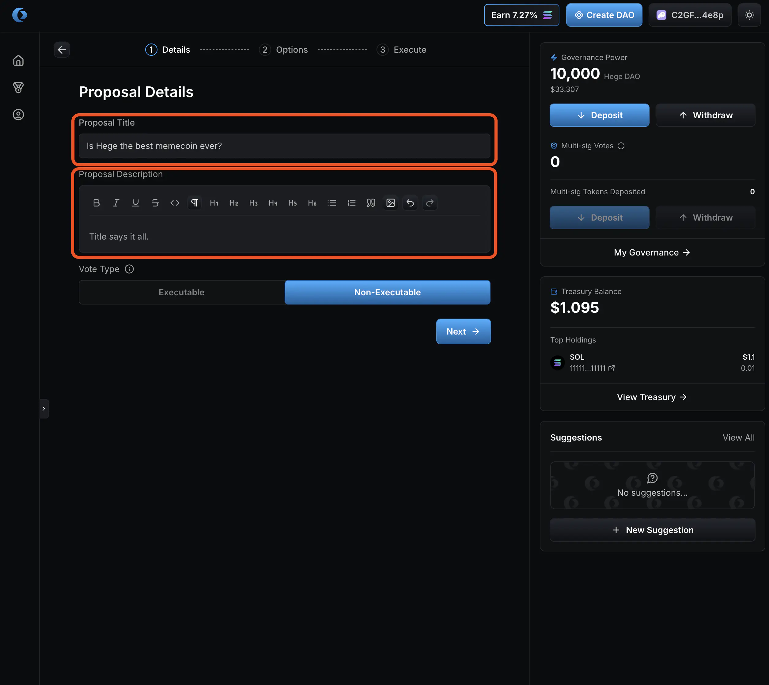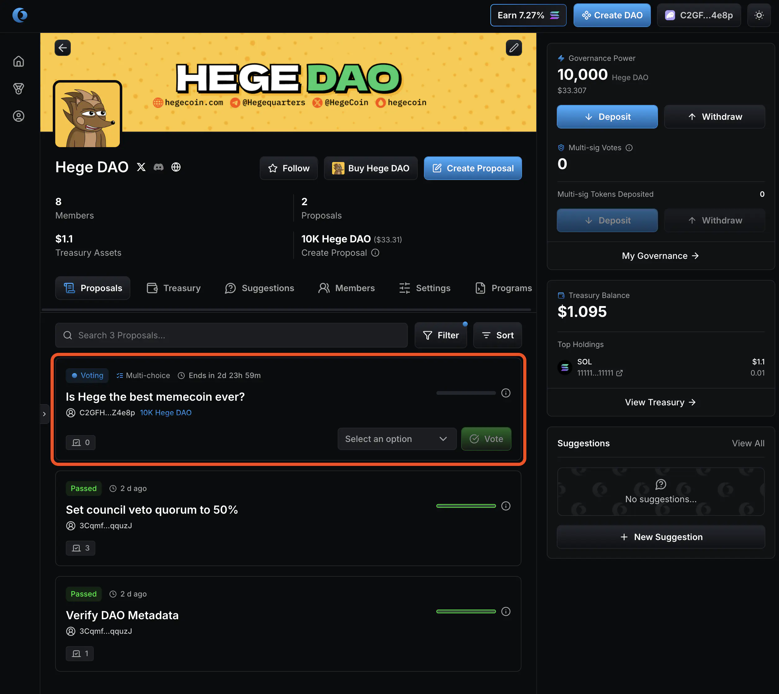 - That’s it! Your proposal is created and open for voting. Now go share it with the Hege community! And don’t forget to vote on your proposal. See How to Vote in the Hege DAO if you need help with that.