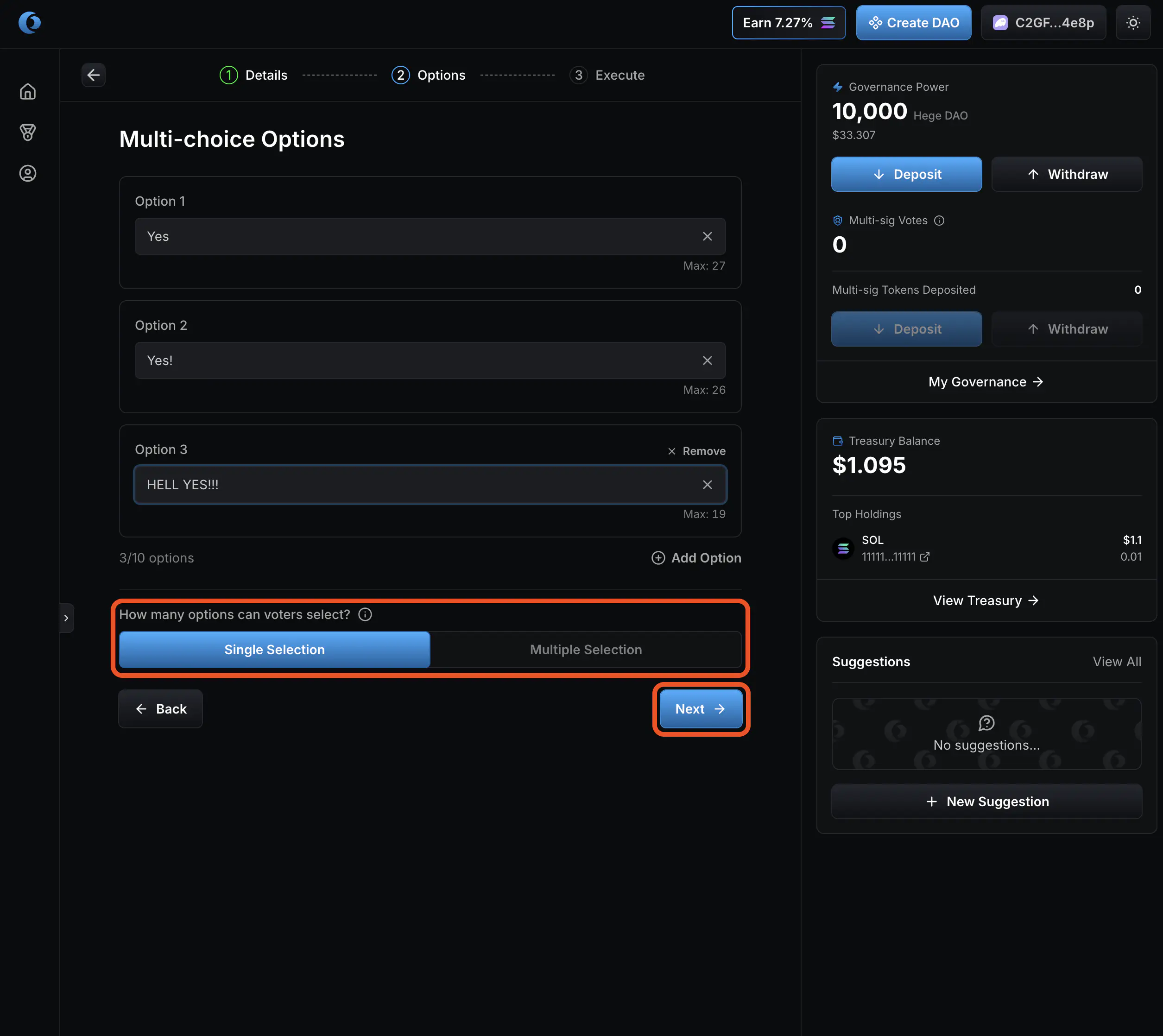 - Select “No” on vote by multi-sig. Then click “Create Proposal”.