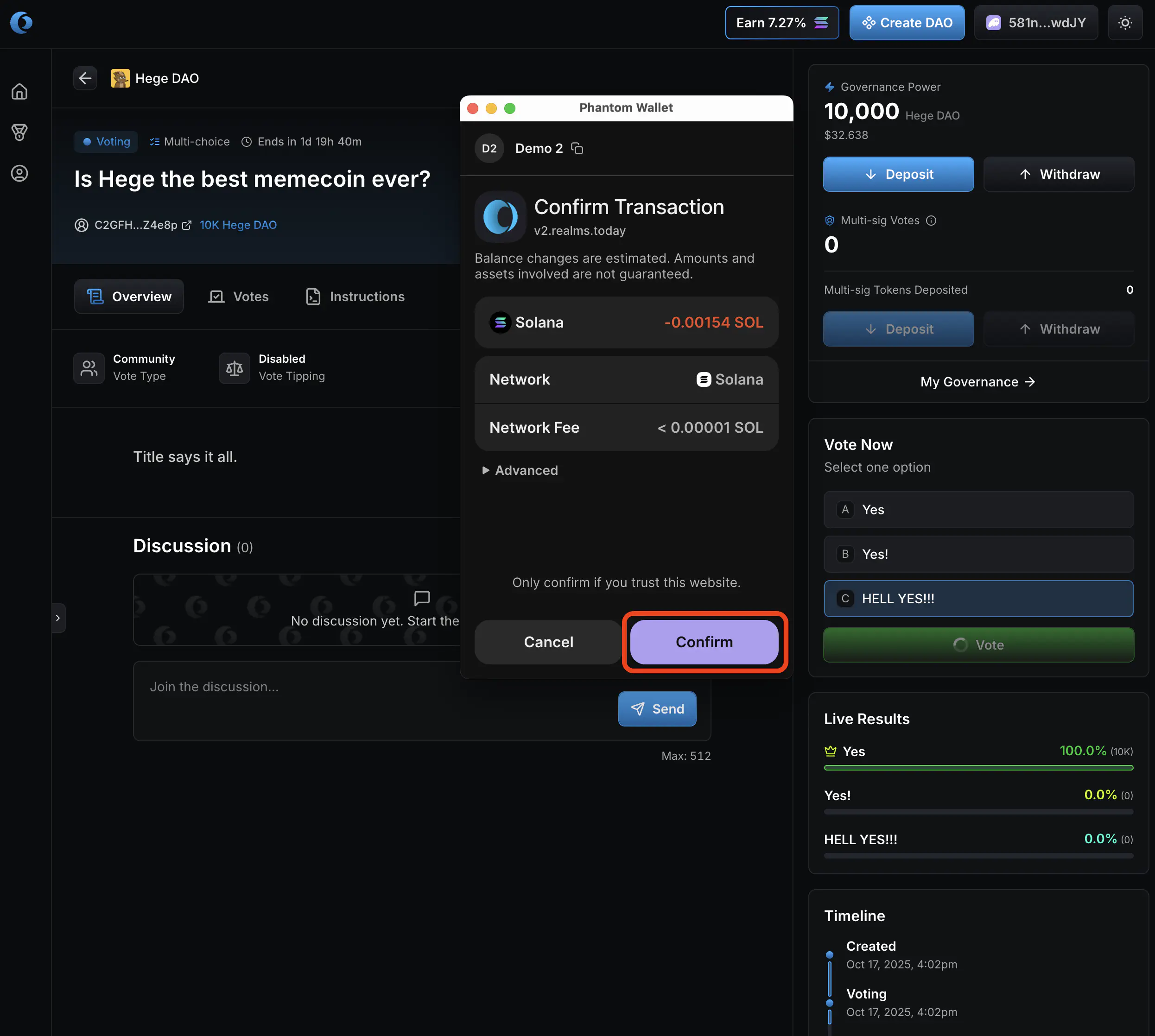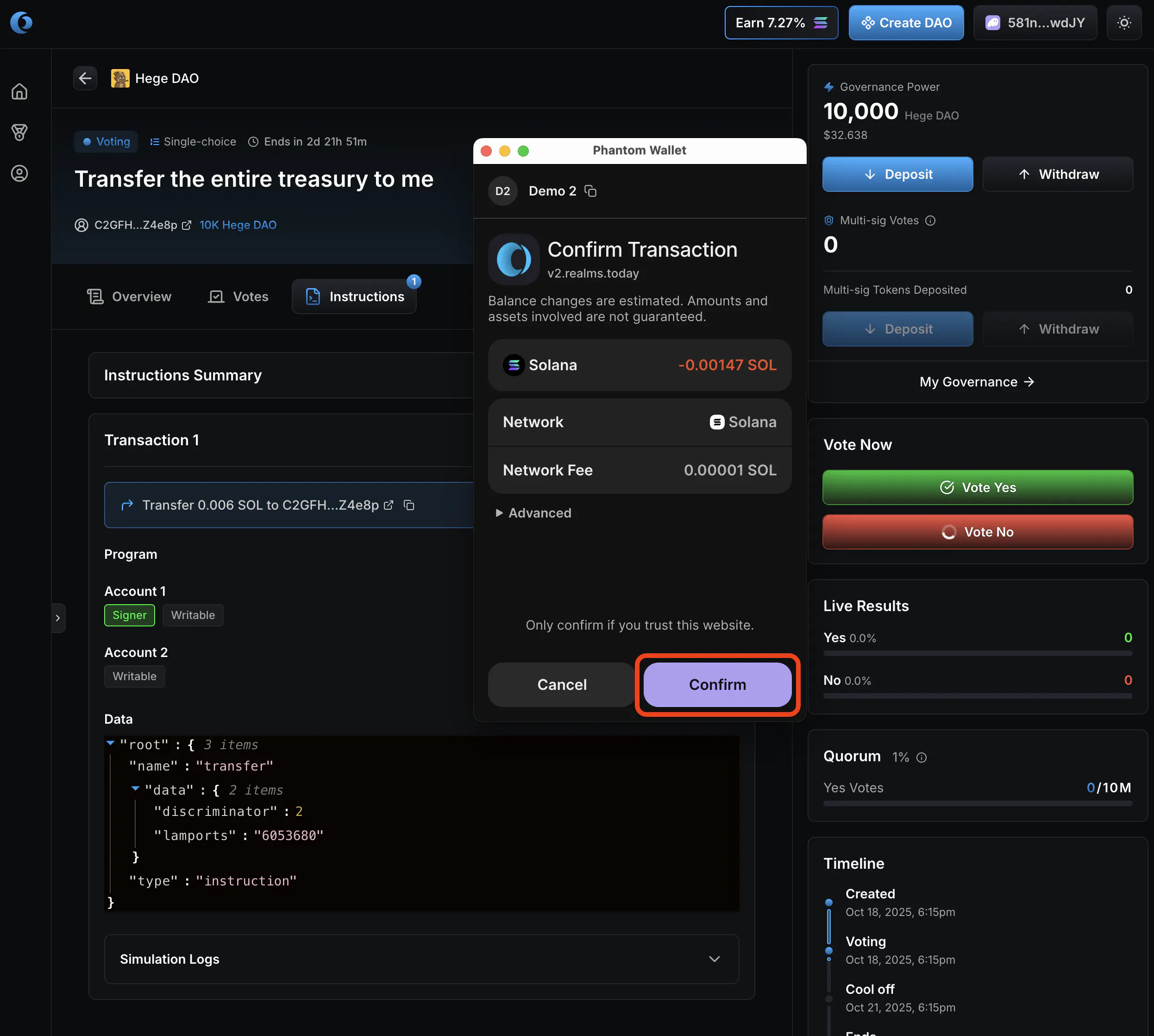 - Confirm the vote in your Solana wallet.