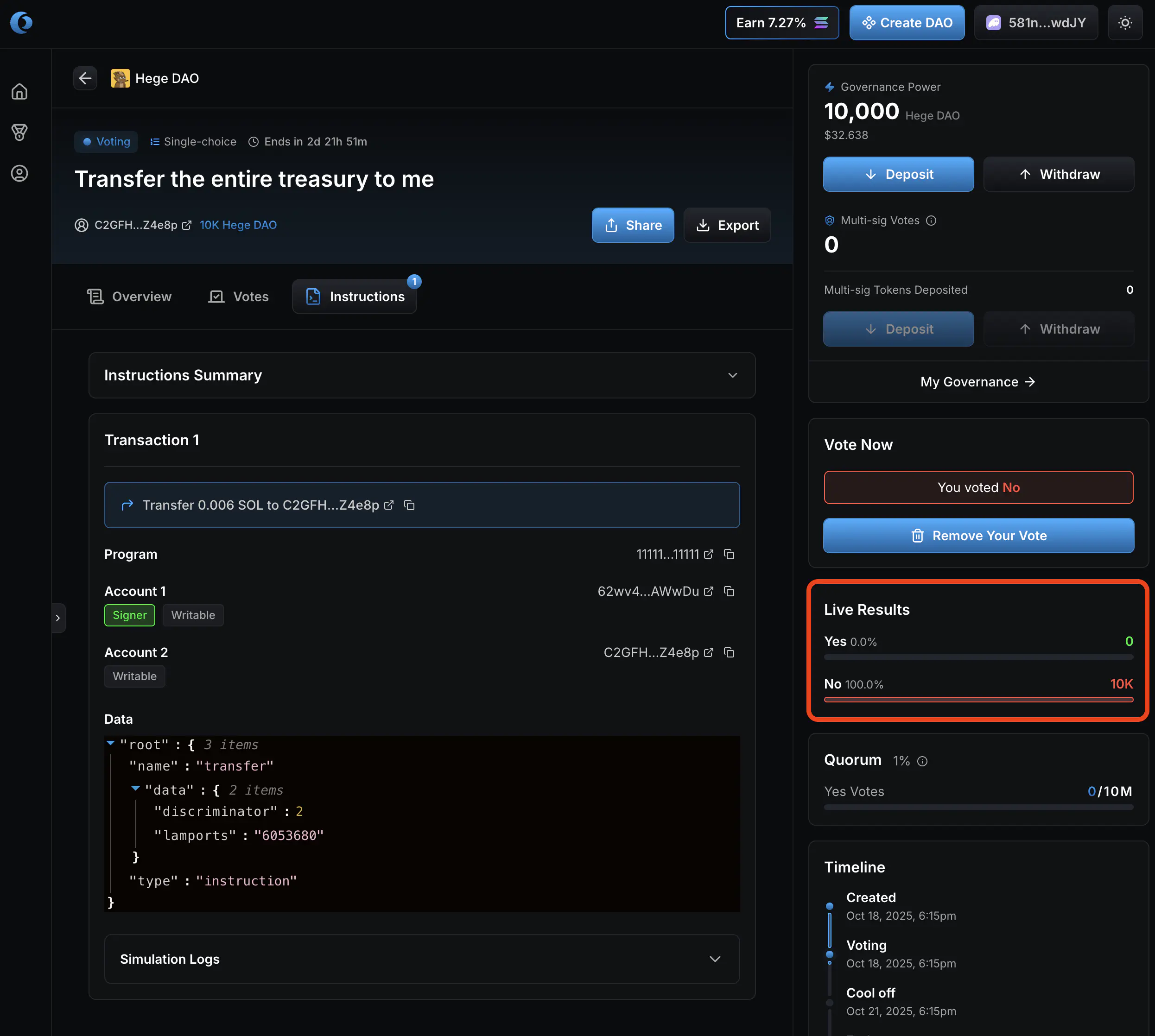 - You have now voted! Once the vote has confirmed on the Solana blockchain, the voting results will update to reflect your vote.