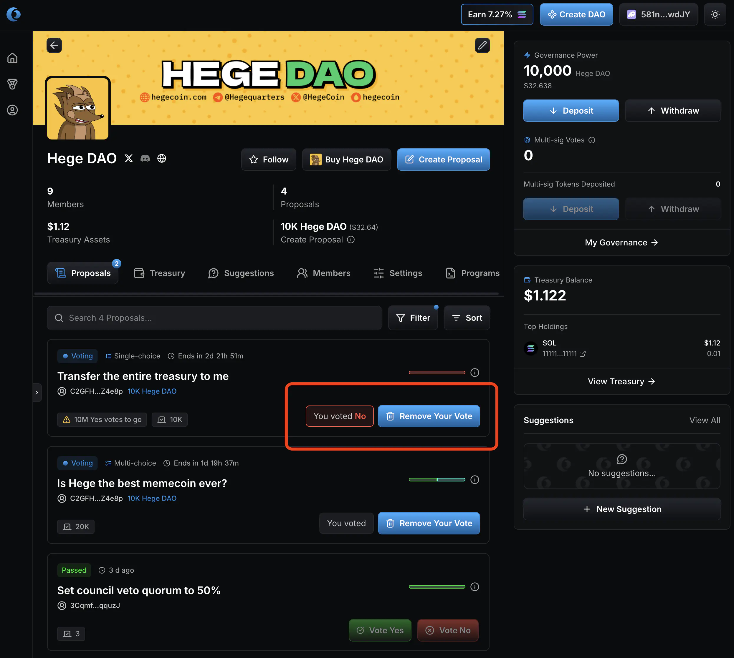 - Now it’s up to you as a member of the Hege DAO to judge if you think these funds should be spend or not, and vote accordingly. Click “Vote Yes” if you approve the transfer of the funds. Otherwise click “Vote No”.