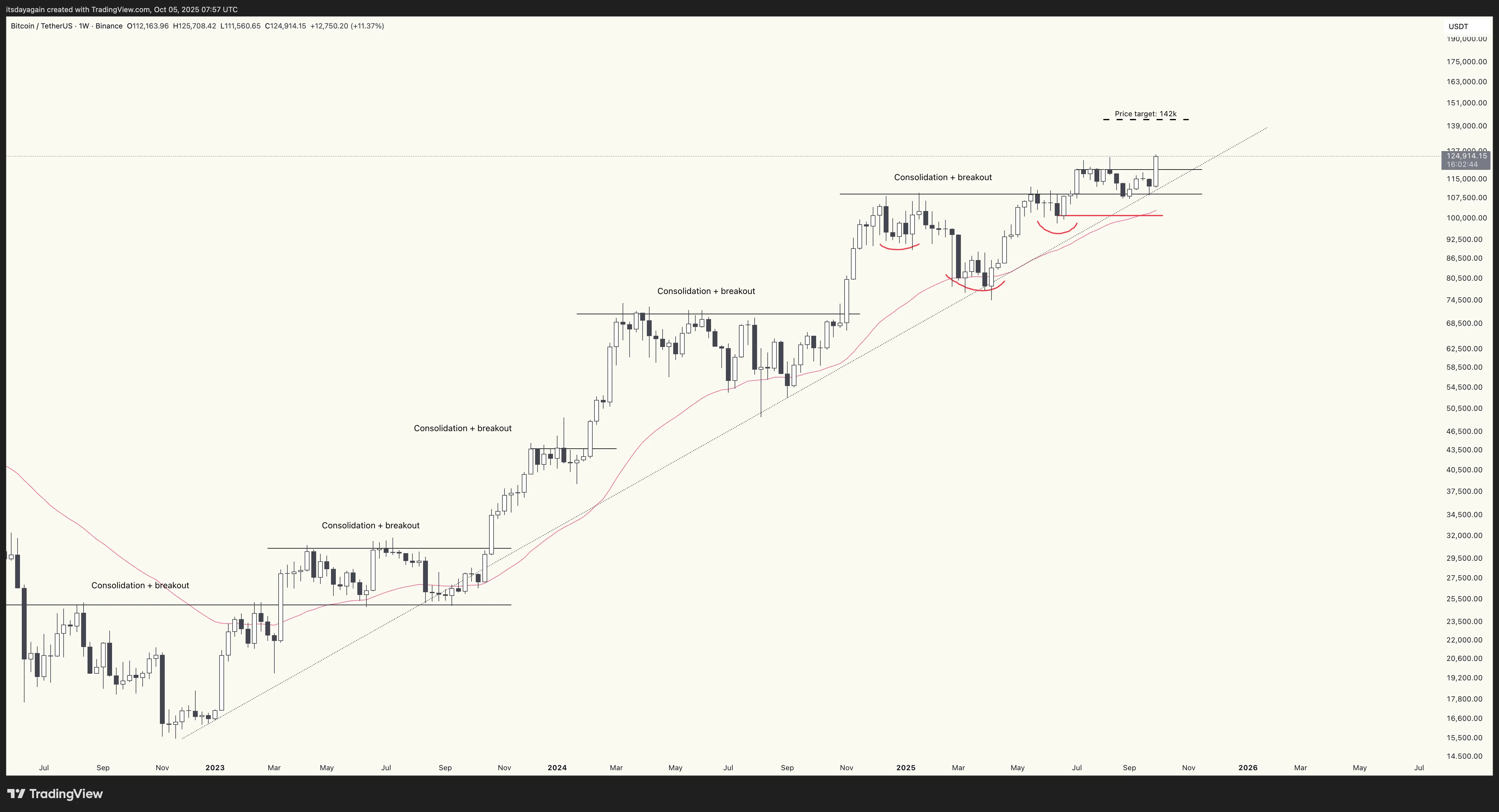 There is of course still the slight chance that this breakout will turn out to be a fake-out, leading to a new dump. But this is very much not the main scenario right now. Bitcoin breaking out into new highs is extremely bullish. Period. It can now continue towards the price target of $142k. Remember that we first set this target all the way back on July 13th, and we have maintained it every single week since then.