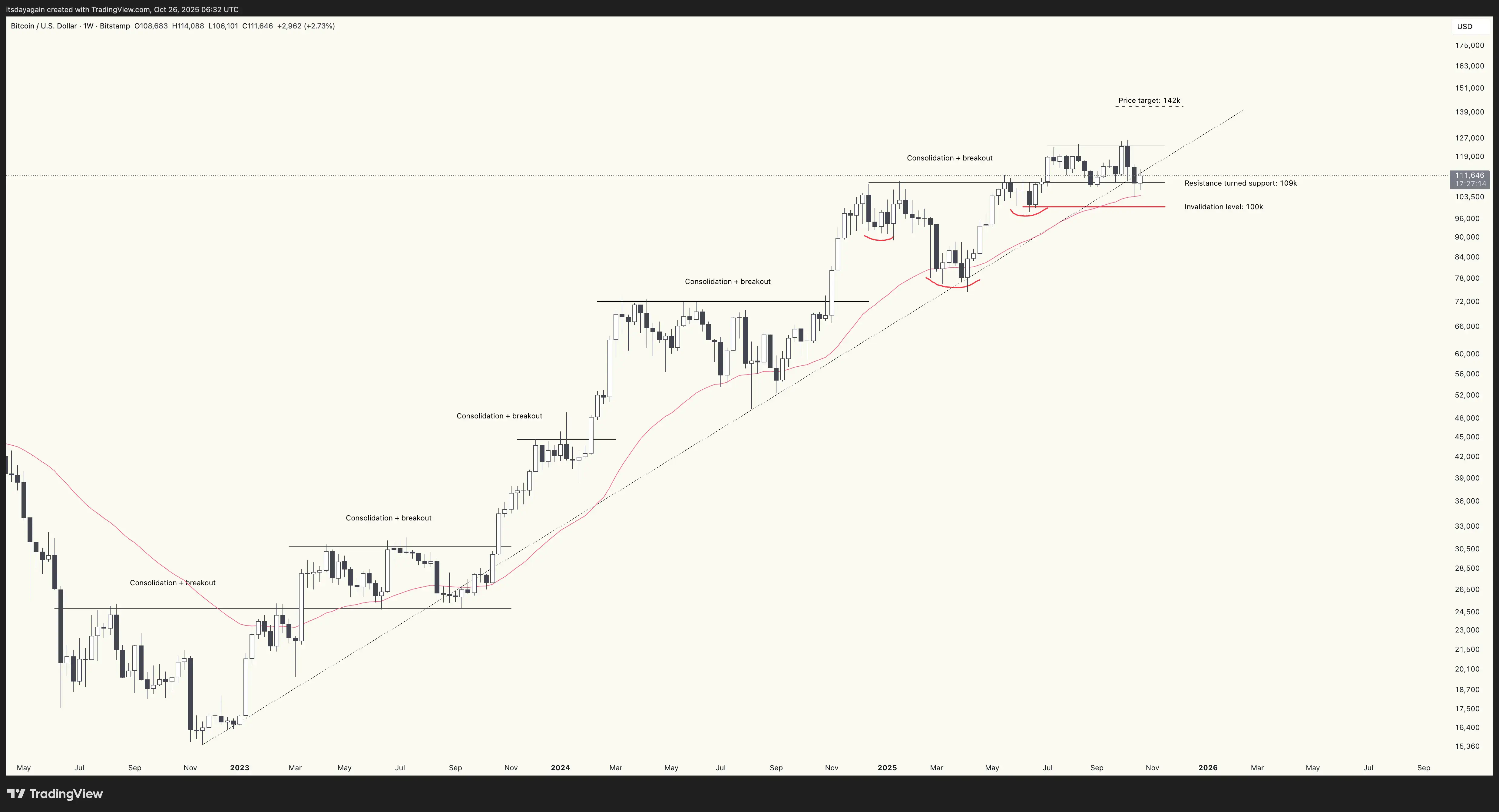The week has not closed yet, but it looks like bitcoin will comfortably close above $109k yet another week. Holding this support, in combination with strong stock markets, and ETF flows turning positive again, sets up a good base for the possibility of a renewed rally into the end of the year. Meanwhile, the conservative price target at $142k remains.